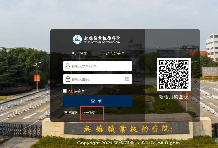 登录账号为统一认证账号,即正式学号。初次登录时需要激活账号,点击“账号激活”根据提示操作即可。