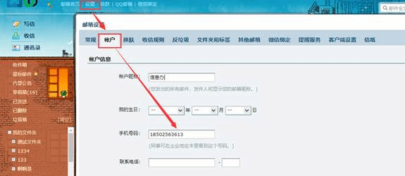步骤一 绑定手机。打开设置。登录邮箱后,通过“设置”-“帐户”-“手机号码”,填写自己的手机号码。
