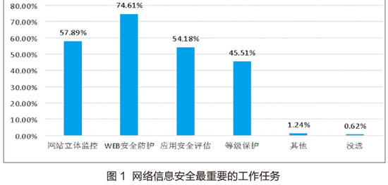 本次调研结果显示,高校用户对安全问题非常关注,其中针对网络信息安全最重要的工作任务是Web安全防护,比例高达74.61%。从图1看到,网站立体监控、应用安全评估也是学校比较重视的工作。