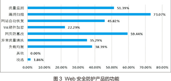 在针对Web安全防护产品的哪些功能对高校网络安全具有重要作用的问题中,被调查用户选择漏洞扫描功能的比例最高,其次是网页防篡改,从图3看到,选择流量监测、网站自动恢复的比例也较高,负载均衡也比较受学校关注。