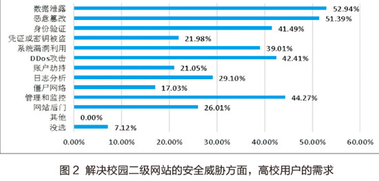 从本次调查结果可以看到,高校网络中心负责人和技术人员普遍对云安全已有了解,并且有更深入接触和应用的需求。接受调查的用户表明在解决校园二级网站的安全威胁方面,云安全较传统方式具有比较明显的优势,其中防数据泄露的高校用户需求比例最高,其次为恶意篡改。管理和监控、防DDos攻击、身份验证的比例也较高,系统漏洞利用也比较受学校关注,见图2。