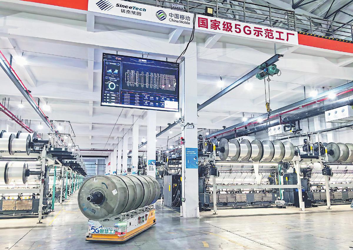 “5G+AGV”自动接单、无人搬运并自动运输经轴,助力工厂高效不间断生产。